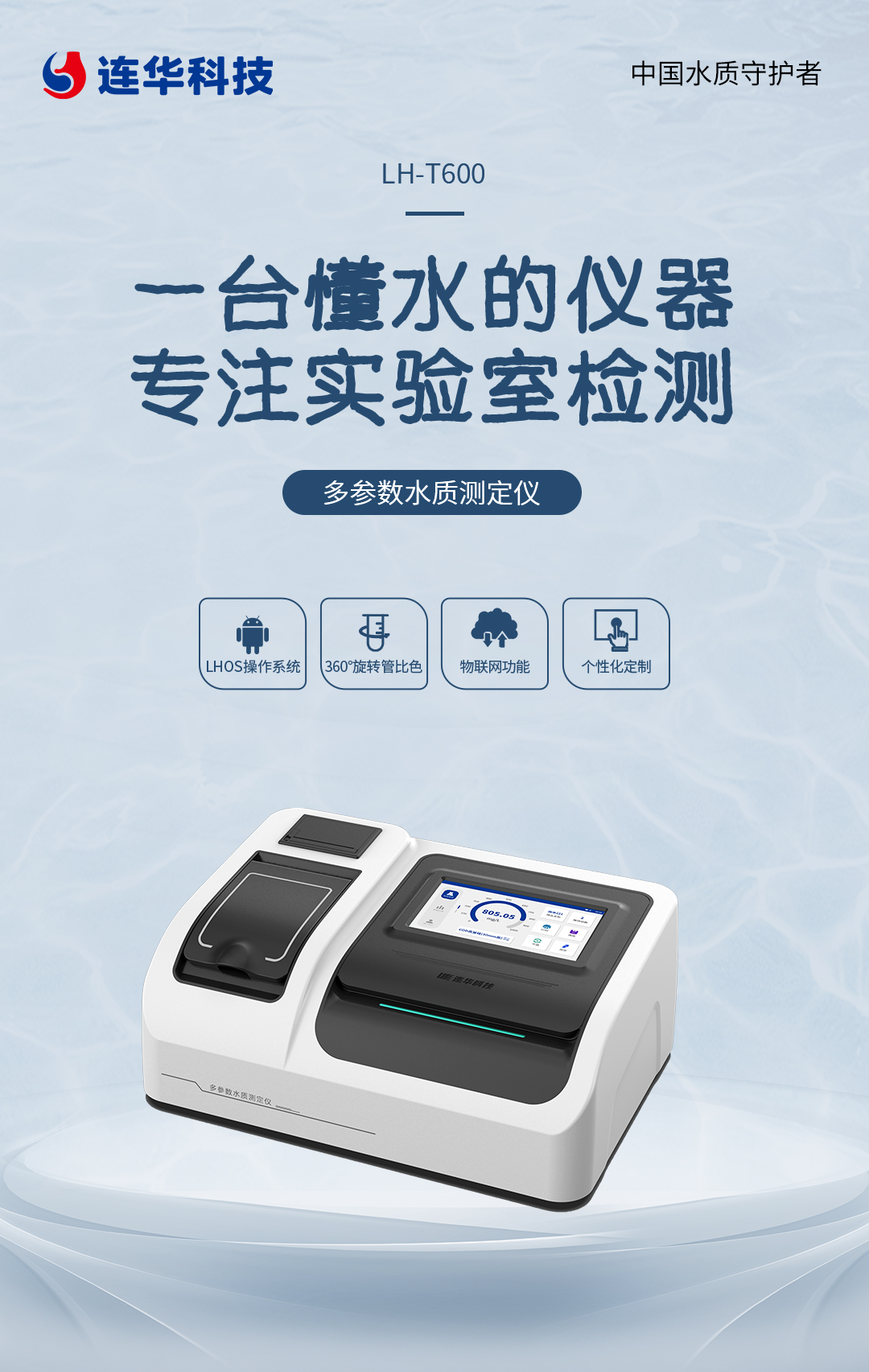 連華科技清瀾系列LH-T600多參數(shù)水質(zhì)測定儀,專注于實驗室水質(zhì)檢測,其卓越的多指標(biāo)檢測能力、創(chuàng)新的LHO操作系統(tǒng)、靈活的指標(biāo)個性化定制及強大的物聯(lián)網(wǎng)功能,不僅符合國家行業(yè)相關(guān)標(biāo)準(zhǔn),更是實驗室水質(zhì)檢測領(lǐng)域的全能選手。